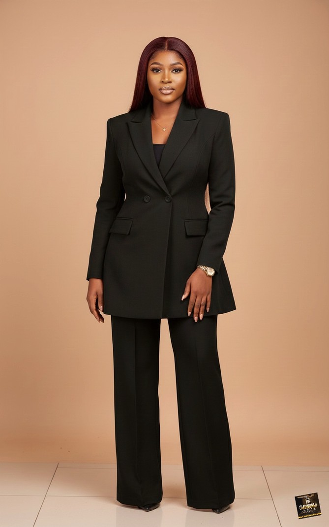 Elegance takes a darker turn with this deep plum suit. The blazer features a "longline" cut, falling just below the hips for a tunic-like effect that provides extra coverage and a sleek vertical line. The rich, black-colored hue is perfect for cooler seasons or evening wear. Paired with wide-leg trousers that drape effortlessly, this suit moves gracefully with the wearer.