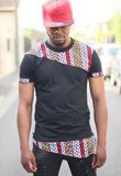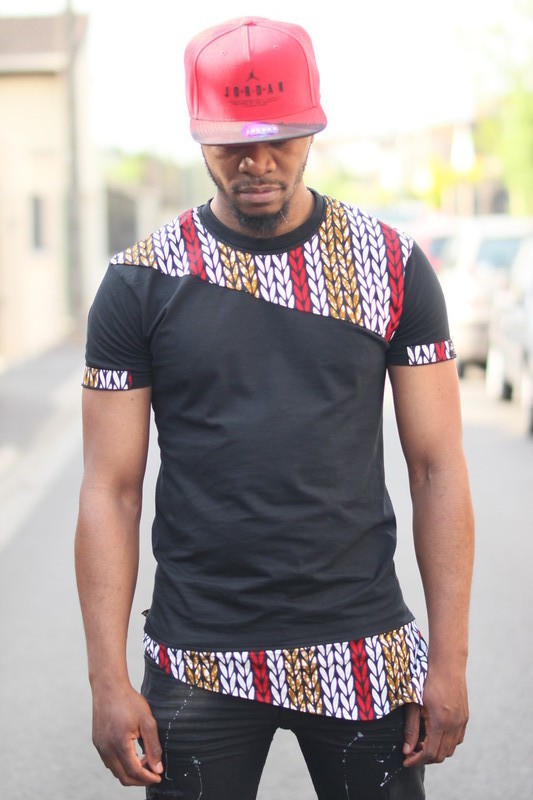 Mixed cotton and wax t-shirt (African fabric). The model is wearing a size M.