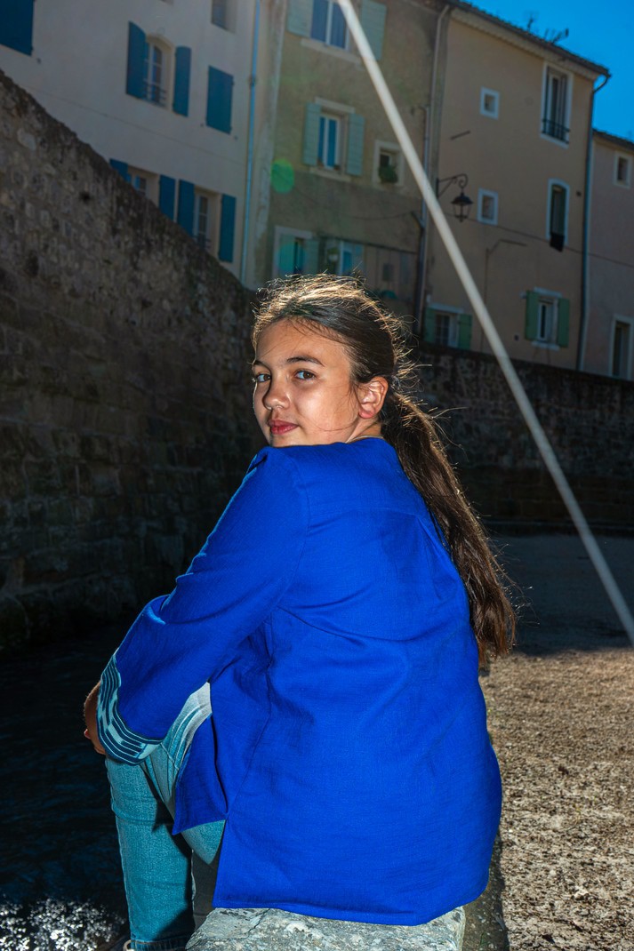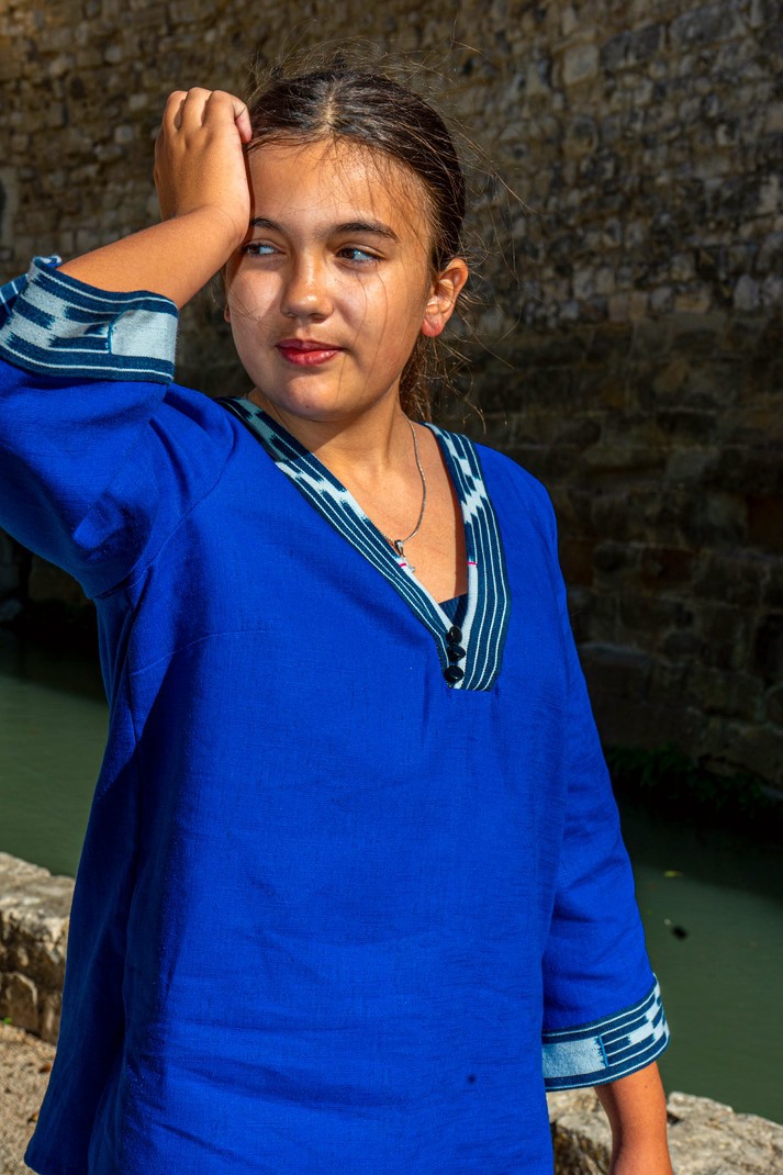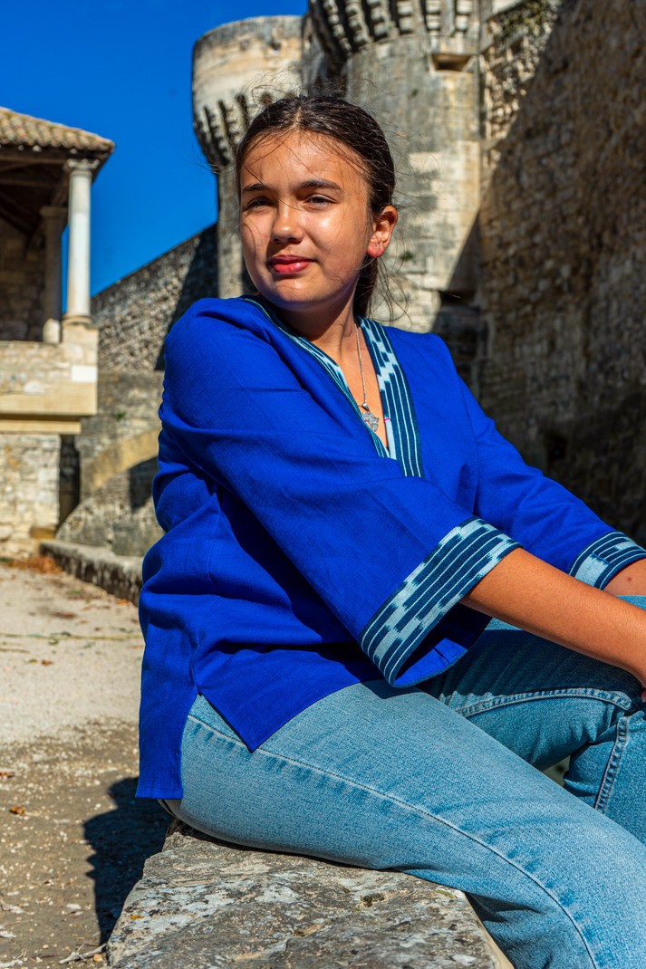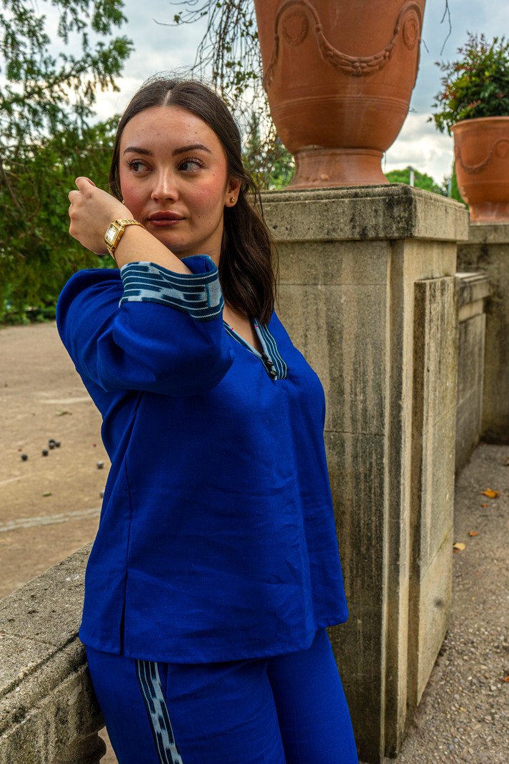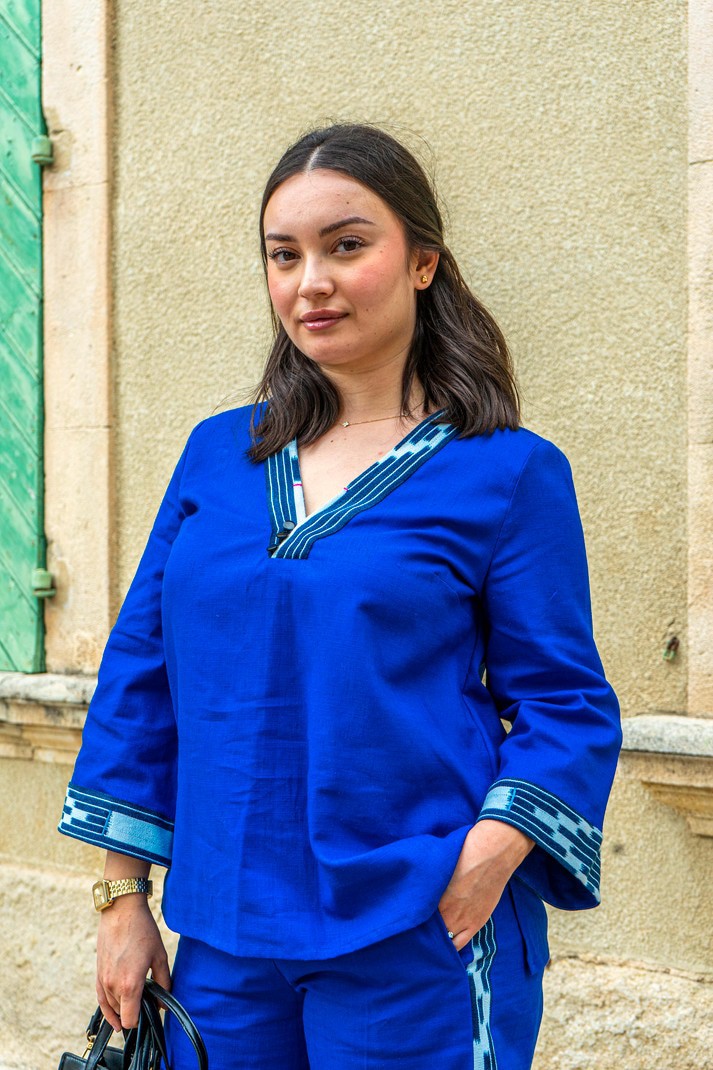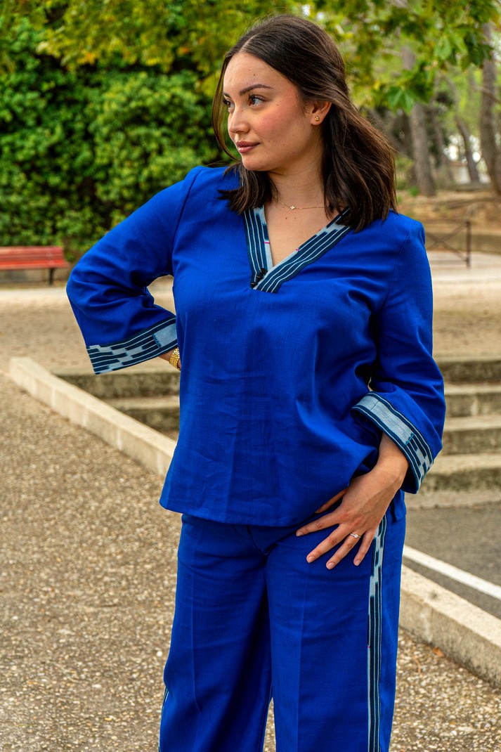 Une blouse comme une respiration légère… Nkonim célèbre l'élégance naturelle avec un soupçon d'exotisme, pour celles qui veulent porter leur accomplissement avec douceur et force à la fois. Ce modèle bleu saphir, profond et intense, est sublimé par un galon tissé selon le savoir-faire du pagne Sénoufo de Côte d'Ivoire. Une invitation à la distinction discrète. Coupe ample et aérienne, manches ¾ soulignées d'un délicat galon tissé principal. Décolleté V croisé, ponctué de petits boutons comme des bijoux discrets. Fentes latérales et pli d'aisance dans le dos : vous êtes libre de vos mouvements, en toute élégance. Finitions raffinées en coutures anglaises : aussi belles à l'intérieur qu'à l'extérieur. Matière naturelle et thermorégulatrice : le lin vous enveloppe d'une fraîcheur légère en été et d'une chaleur douce en hiver. Matières & composition Lin 100 % (240 g/m²) Tailles : S, M, L, XL Entretien : Lavage délicat 30 °C – Repassage doux sur l'envers Confection & livraison sous 2–3 semaines
