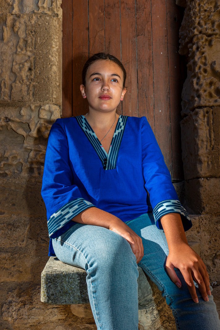 Coupe ample et aérienne, manches ¾ soulignées d’un délicat galon tissé main.