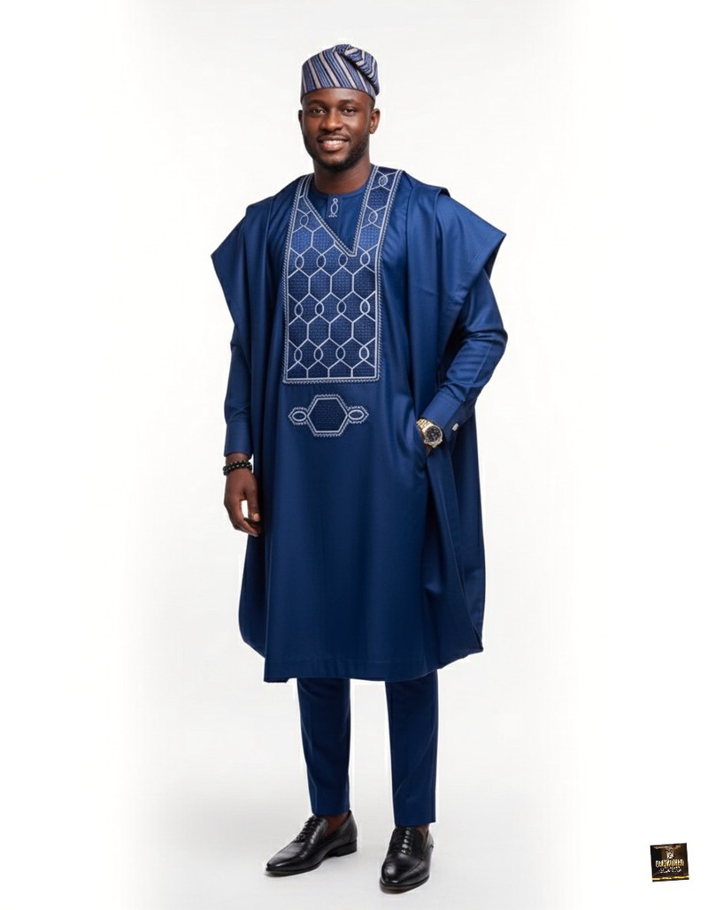 Make a bold statement with this luxury blue agbada set, a perfect blend of tradition and modern sophistication. Expertly tailored from premium quality fabric, this three-piece outfit includes a long embroidered agbada robe, a matching inner top, and well-fitted trousers. The detailed embroidery adds a regal touch, making it ideal for weddings, traditional ceremonies, and special occasions.