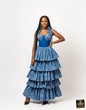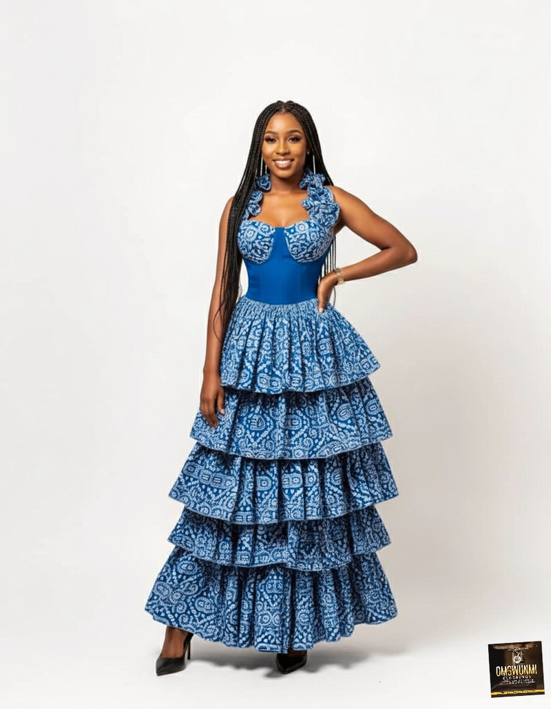 This show-stopping blue layered gown perfectly balances elegance and cultural flair. The fitted corset-style bodice accentuates the waist, while the tiered ruffled skirt creates a stunning, voluminous silhouette. Made from rich red adire fabric with intricate white patterns, this gown is ideal for weddings, parties, or any special occasion. The floral shoulder detailing adds a touch of drama and sophistication.