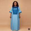 A stunning light blue kaftan dress cut from a smooth, luxurious fabric. The focal point is a central panel of vibrant royal blue sequins that catch the light beautifully, providing a glamorous contrast. The wide, three-quarter sleeves maintain the traditional kaftan's comfortable fit.