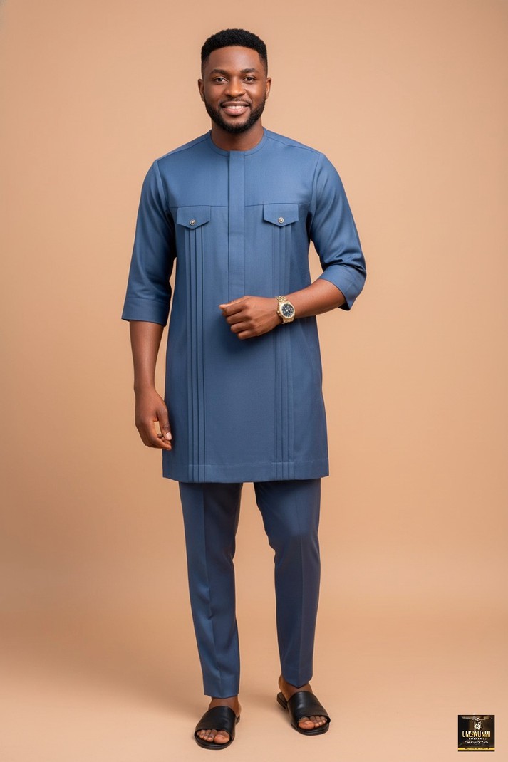 A structured, elegant set in a deep, versatile Slate Blue. The top features 3/4 sleeves, a band collar, and a unique pleated detail running down the front torso. It's finished with two neat flap pockets on the chest, adding a subtle military-inspired touch. Perfect for Professional settings and sophisticated semi-formal gatherings.