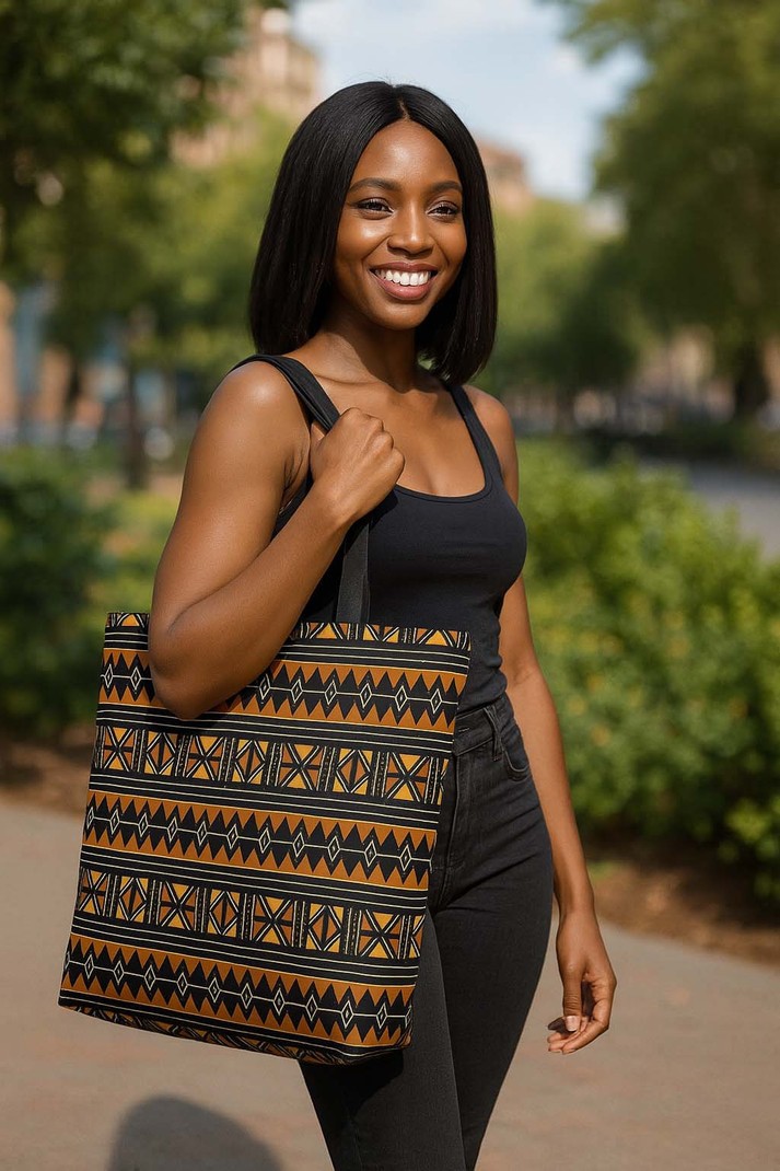 Make a statement with this bold Bogolan African American tote bag. Featuring Afro fashion patterns, this bag is perfect for holding all your essentials while showing off your unique style. With a large capacity, it's perfect for those who love to take risks and embrace adventure! Product Description • 510 g/m2. Made from high-grade canvas. • Durable and roomy enough for your daily items. • Lightweight canvas tote bag with sturdy handle is easy to carry. • Perfect for shopping and carrying your essentials. Delivery Time This item will be processed within 3-7 business days (Excluding Weekends and Holidays). Once products ships it can take up to 15 Business days depending on your location. Out of Stock items can be requested by emailing us at [email protected] Care Instructions Machine wash cold inside out. Gentle cycle with mild detergent and like colors. Do not use bleach or fabric softener. Do not tumble dry. Hang to dry to ensure maximum shelf life. Iron inside out if necessary. Do not iron the print. Do not dry clean.