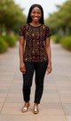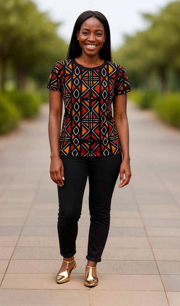 This Bogolan Print Women T-shirt is made from lightweight cotton, making it ideal for summer. It's stylishly printed with a traditional Bogolan design in muted and vivid colors. Perfect for a casual look.