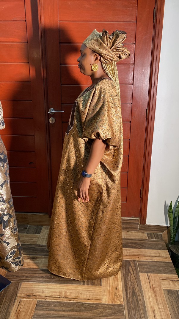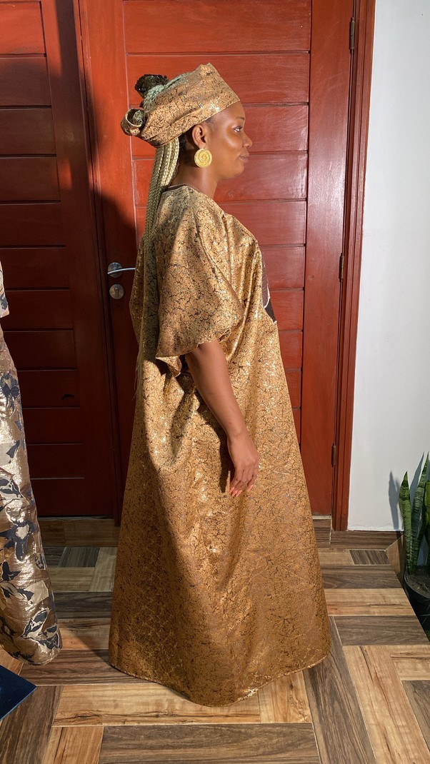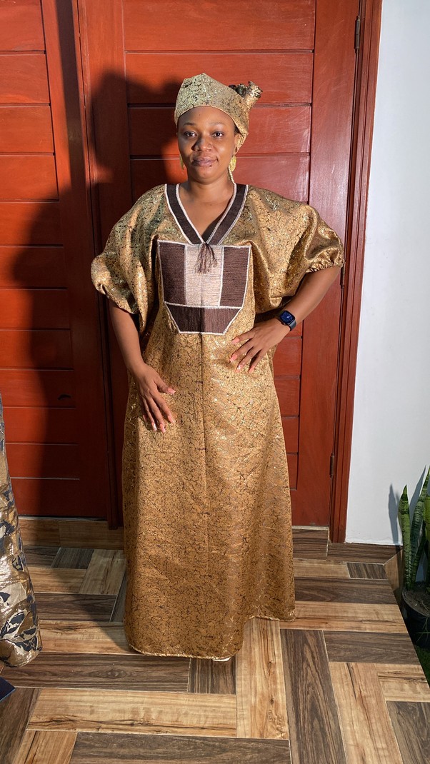 Very Beautiful boubou in Gold metallic Damask fabric embroidered with an internal rope and a women's scarf suitable for all sizes and occasions. If you want to stand out during ceremonies and outings this is for you. Standard Sizes (XS, S, M, L, XL)