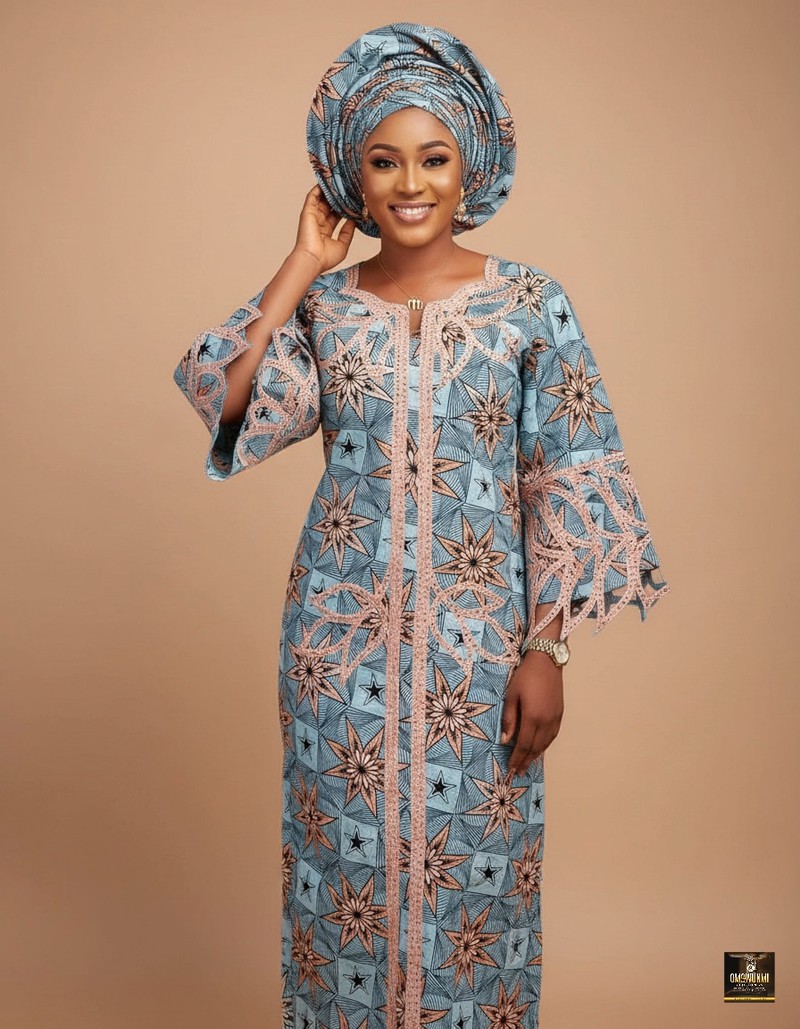 Infused with delicate charm, this stunning full-length African print gown features a subtle yet intricate pattern of repeating starburst and geometric motifs in soft powder blue, slate gray, and muted coral hues. The dress boasts an elegant column silhouette, beautifully detailed with a comprehensive network of fine coral lace or braiding that traces the vertical center line and outlines the dominant star shapes throughout the fabric, creating a remarkable embroidered effect. The stylish three-quarter length sleeves are the focal point, featuring the same exquisite coral lace trim cut into a scalloped edge around the cuffs for a feminine, airy finish. Paired with a magnificent, multi-layered matching gele (head-tie), this gown is a perfect choice for sophisticated occasions, offering a blend of traditional African textile design with a soft, contemporary color palette and intricate textural detailing.