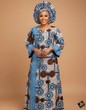 Elegant and vibrant, this full-length African print gown is a stunning showcase of traditional style with modern refinement. Crafted from a bold Ankara fabric, the dress features a captivating pattern of interlocking circles and geometric motifs in shades of rich brown, sky blue, and white, set against a subtle background grid. The flattering silhouette boasts a neat round neckline and three-quarter length bell sleeves, which are beautifully accented with a delicate, intricately-stitched blue lace trim. A prominent vertical panel of the same striking blue lace runs down the side of the dress, adding a gorgeous textural contrast and elongating the figure. Complete with a matching, perfectly-tied gele (head-tie), this dress is the epitome of sophisticated occasion wear, perfect for weddings, ceremonies, or any event where a statement of cultural elegance is desired.