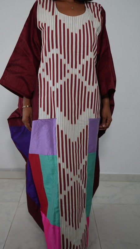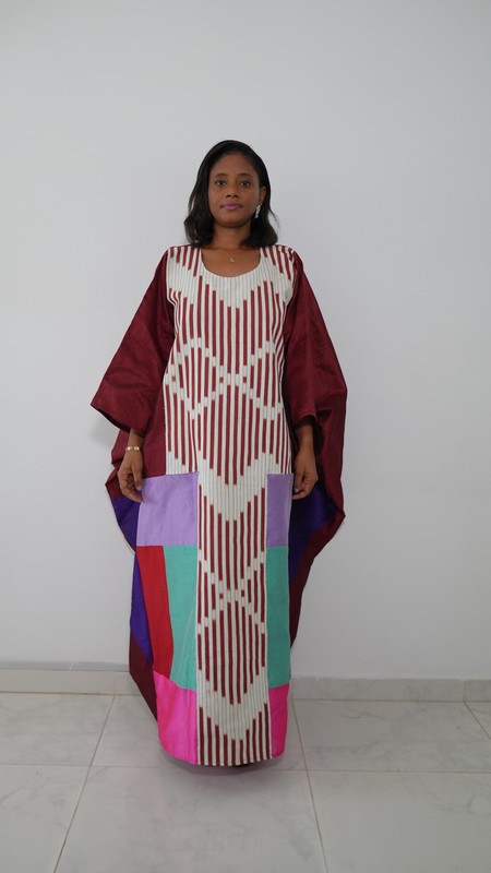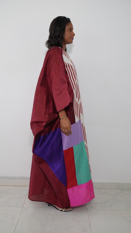 Cette robe évasée style boubou séduit par sa coupe ample et généreuse, pensée pour flotter autour du corps comme une vague. Les couleurs vibrantes, uniques à chaque création, font de chaque apparition un instant de lumière, de personnalité, de présence.