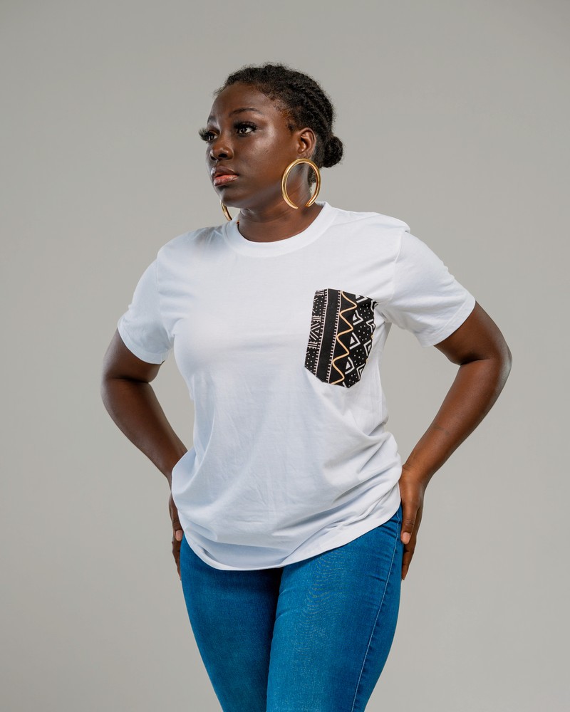Cette box cadeau est composée d’un tee-shirt blanc avec une poche en Wax & d’un bomber en pagne wax, fait main aux motifs colorés.