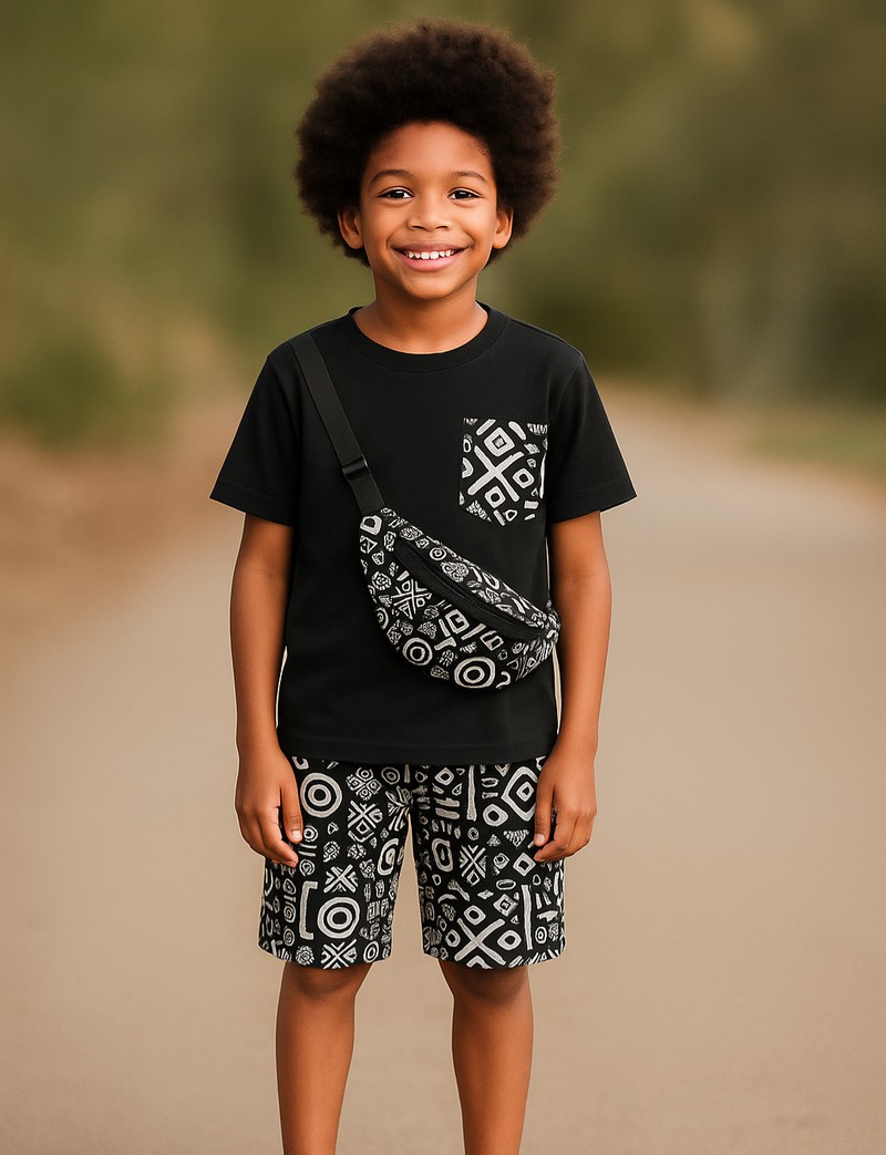 Offrez à votre enfant un style unique qui mêle mode urbaine moderne et motifs africains traditionnels ! Cet ensemble original comprend un tee-shirt noir à poche contrastante, un short assorti, et une banane pratique, le tout sublimé par un tissu inspiré des symboles tribaux africains.