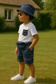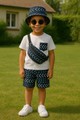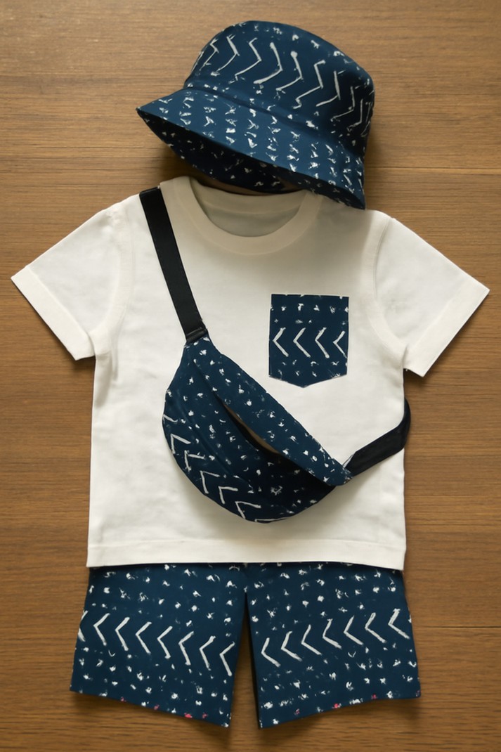 Composé d’un short confortable et d’un t-shirt blanc minimaliste (sans poche pour un rendu épuré), cet ensemble est rehaussé d’accessoires coordonnés : un chapeau bob stylé et un sac banane pour un look à la fois traditionnel et résolument contemporain.