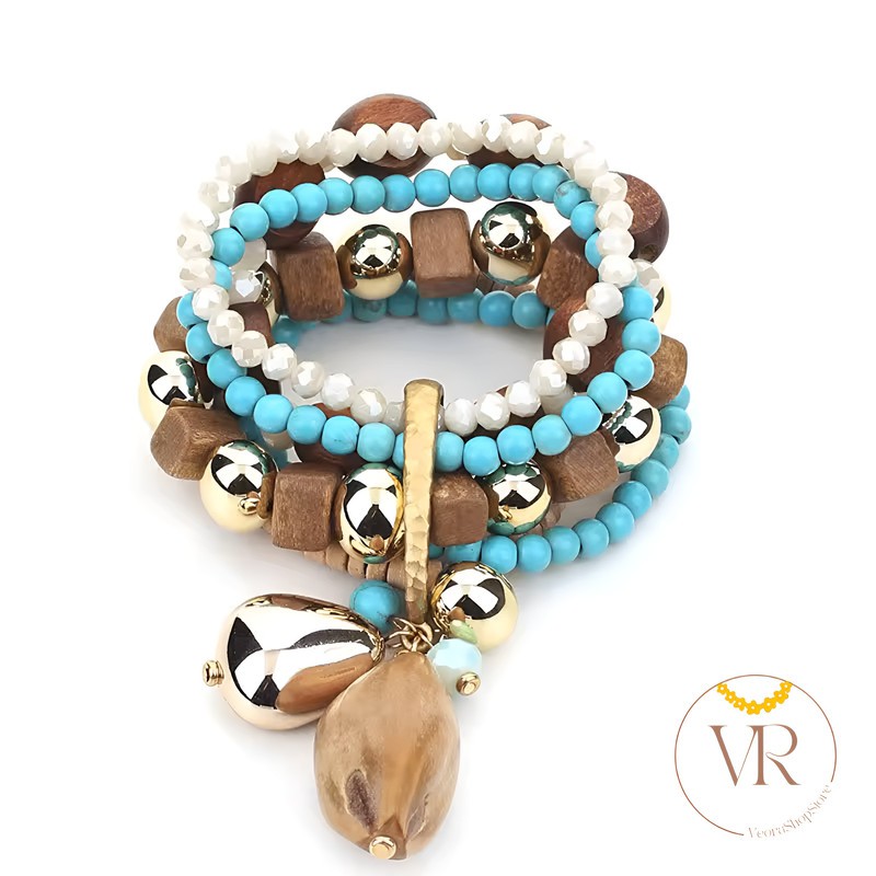 Composé de perles en bois, résine colorée et éléments dorés, il s’enroule harmonieusement autour du poignet. Ses pendentifs naturels et métalliques ajoutent du caractère, faisant de ce bracelet un bijou qui allie authenticité et modernité.