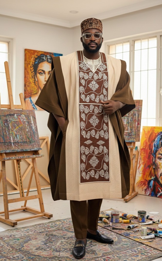 Step into pure elegance with this luxury men’s agbada set, beautifully crafted in rich brown and cream tones. This premium traditional African attire features intricate embroidery across the chest panel, flowing gown, and matching inner wear—perfect for weddings, engagements, cultural celebrations, special occasions, or high-end fashion statements.