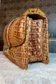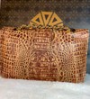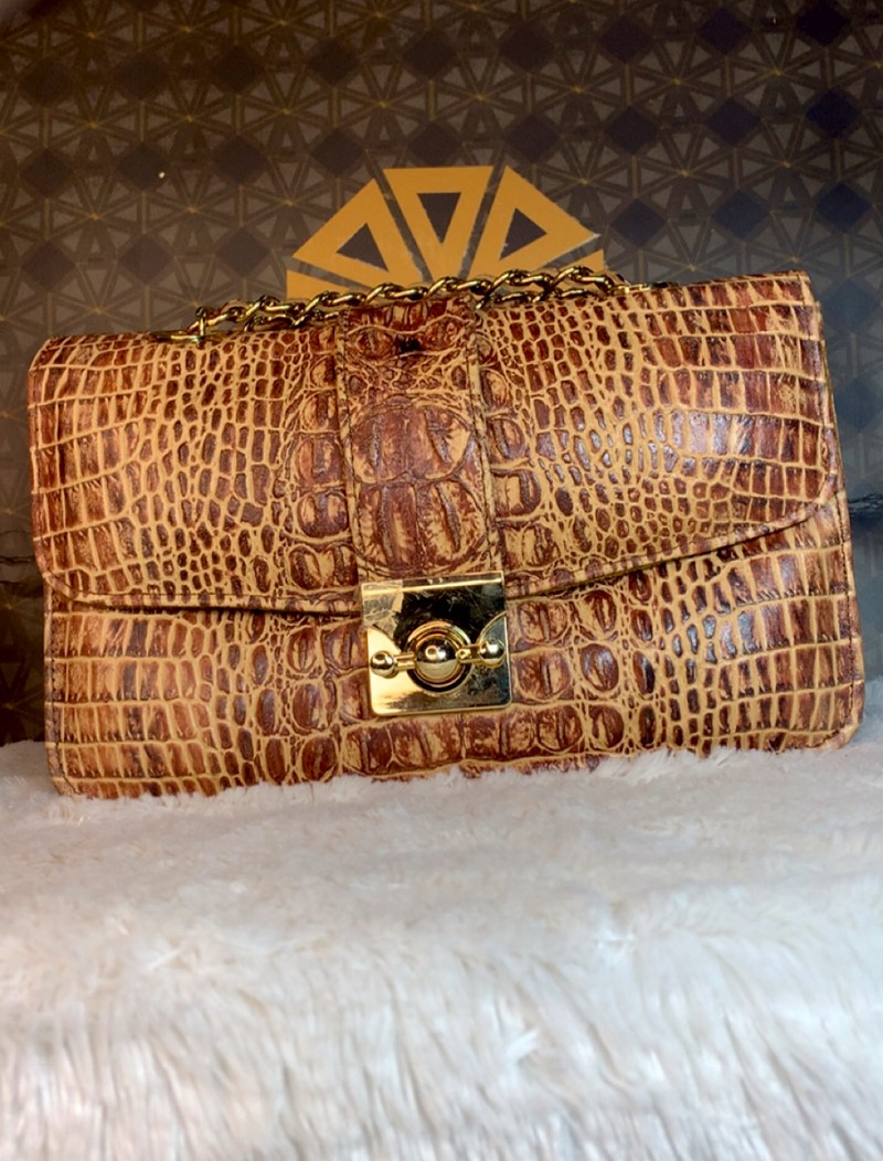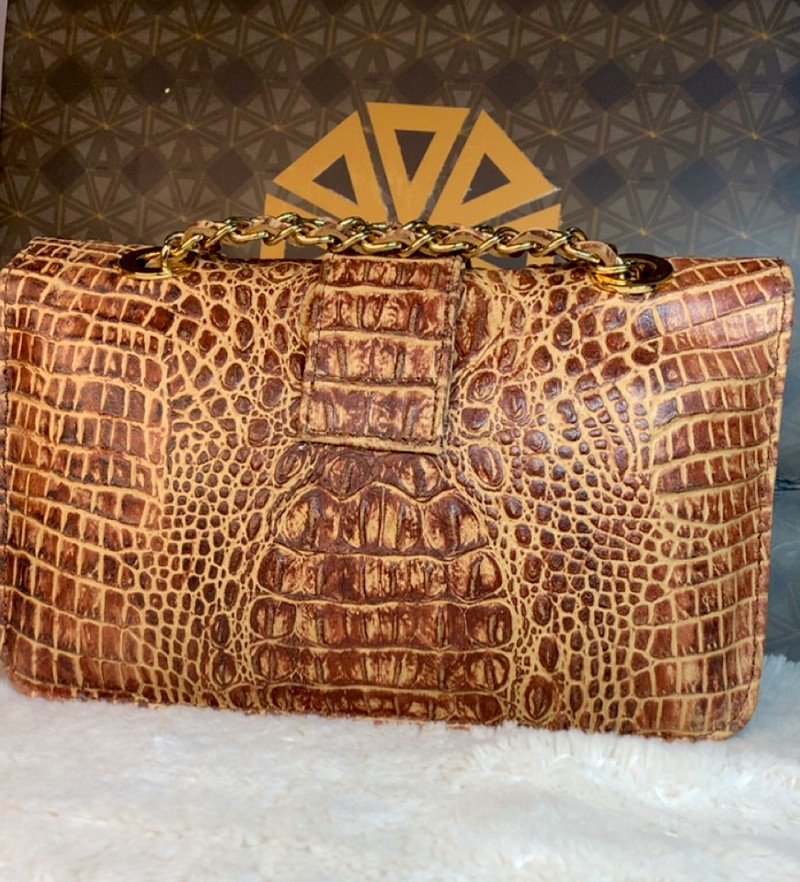 Brown Crocodile Leather Handbag With Gold Tone Chain