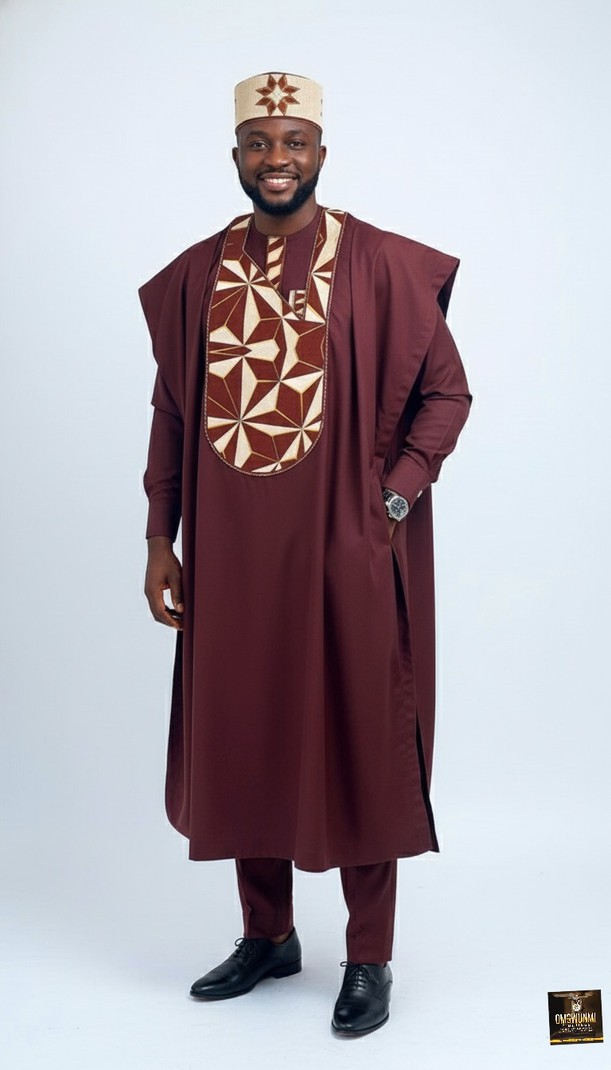 Make a bold statement with this luxury burgundy agbada set, a perfect blend of tradition and modern sophistication. Expertly tailored from premium quality fabric, this three-piece outfit includes a long embroidered agbada robe, a matching inner top, and well-fitted trousers. The detailed embroidery adds a regal touch, making it ideal for weddings, traditional ceremonies, and special occasions.