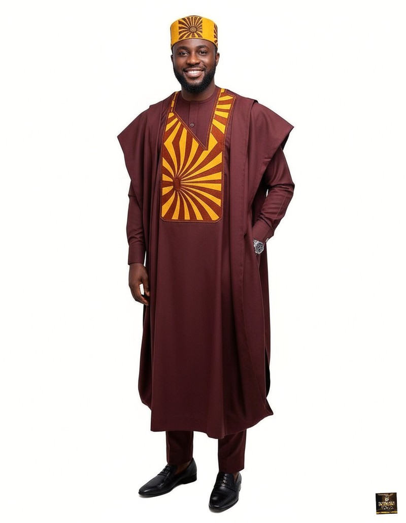 Burgundy Agbada set with cap