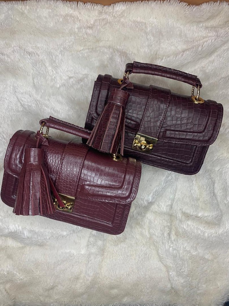 Burgundy croc embossed handbag, featuring rich textured and elegant gold tone hardware. The structured shape keeps it polished, while the matching tassel adds a touch of charm. spacious enough for your essentials, perfect for both day and night wear.