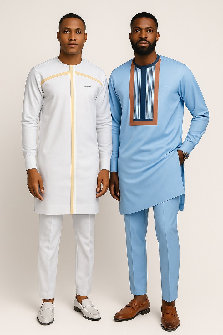 Get these two elegant kaftans together in one order! Once you buy, you receive both stylish outfits complete with matching hats. Perfect for all occasions, designed for comfort and class. Available in all sizes with fast delivery. Order now and own these beautiful kaftans today!