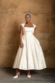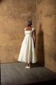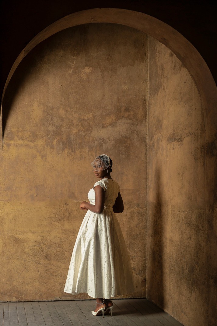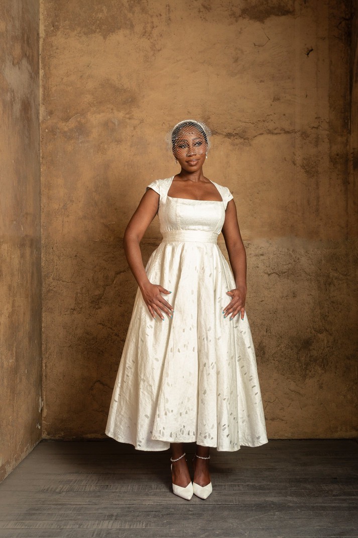 The Cap Sleeve Dress is a Graceful Bridal Midi Dress crafted in luxurious damask organza. It is designed for the modern bride who values simplicity and refined detail, this bridal midi dress balances sculptural tailoring with classic femininity. The bodice offers gentle structure while the skirt delivers airy motion, together they create a silhouette that feels both timeless and contemporary.
