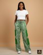 This look features wide-legged cargo-style trousers made from green-and-white patterned Adire fabric with a bold, almost zebra-like design.