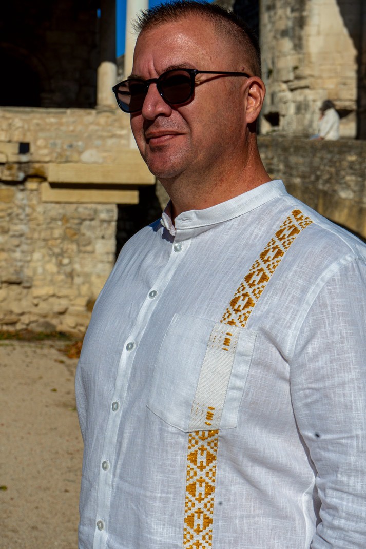 Subtile, forte, intemporelle : Aseda est la chemise qui accompagne vos plus belles conquêtes et vos plus grands moments d'apaisement. Ce modèle est décliné ici en teinte Blanc, réhaussé d'un tissu traditionnel Kente venu du Ghana. Coupe droite moderne, pour une silhouette assurée. Col mao épuré : juste ce qu'il faut de caractère sans excès. Poche poitrine habillée d'une bande de tissu traditionnel, clin d'œil au voyage. Pli d'aisance dos : confort garanti pour bouger librement. Finitions soignées jusque dans les détails des poignets et de l'ourlet arrondi. Lin naturellement thermorégulateur : fraîcheur et confort en toute saison. Matières & composition Lin 100 % (240 g/m²) Tailles : M, L, XL, 2XL Entretien : Lavage délicat 30 °C, repassage doux sur l'envers Confection & livraison sous 2–3 semaines