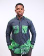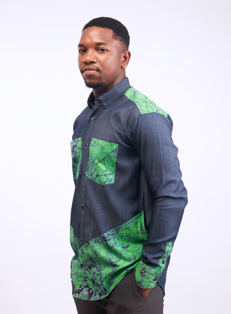 ⭐Chemise homme à manches longues coupée dans un tissu jean et un tissu batik avec un col chemise et des boutons à l'avant ainsi que des poches au niveau de la poitrine.