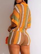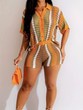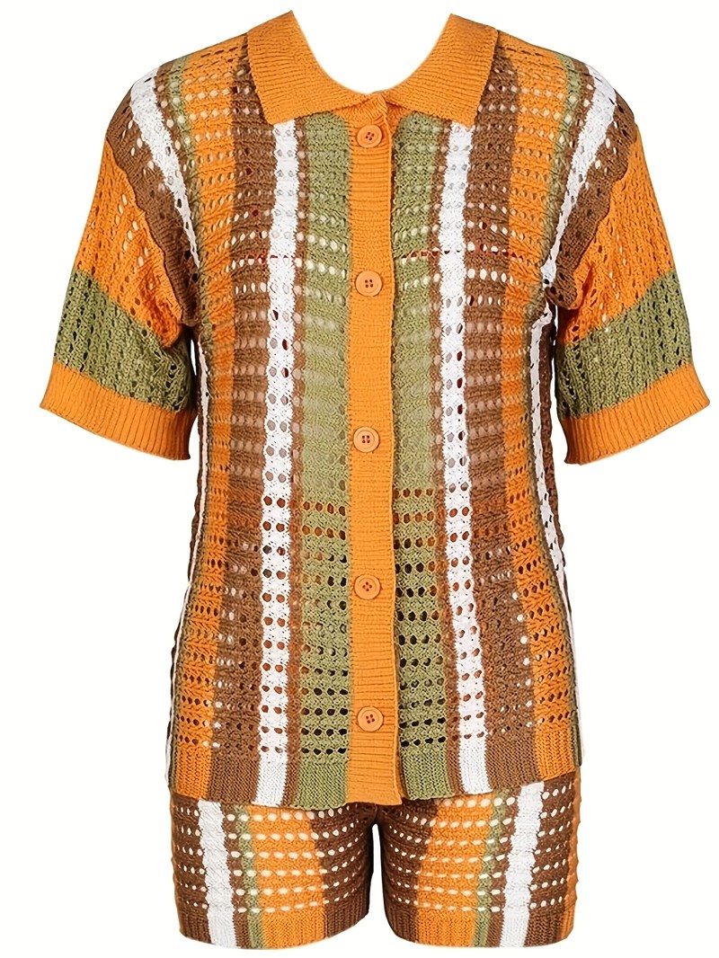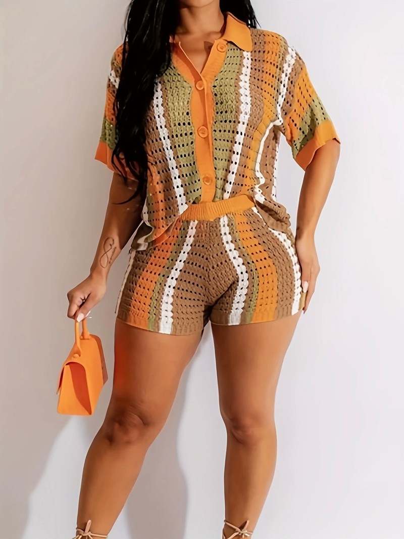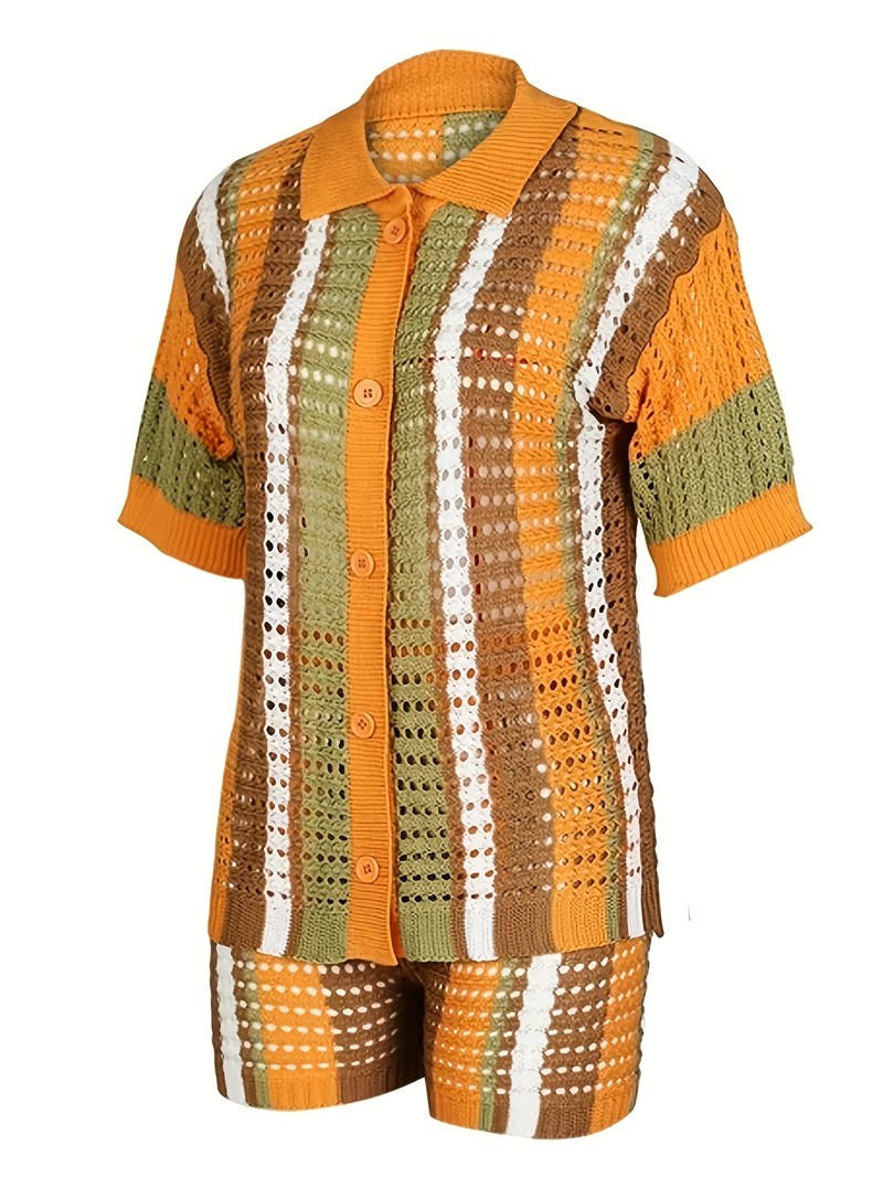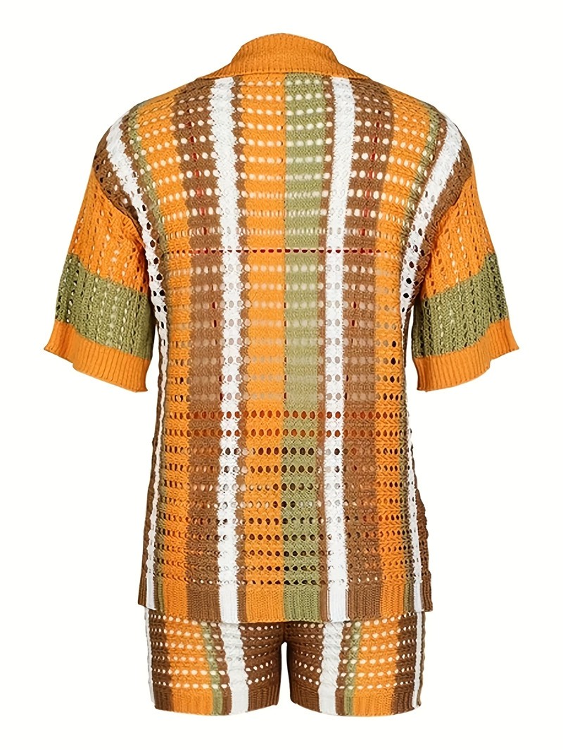 Chic Casual Vacation Two-Piece Set, Latin Shirt Knit Hollow Stripe Women's Top and Pants Outfit