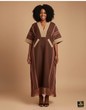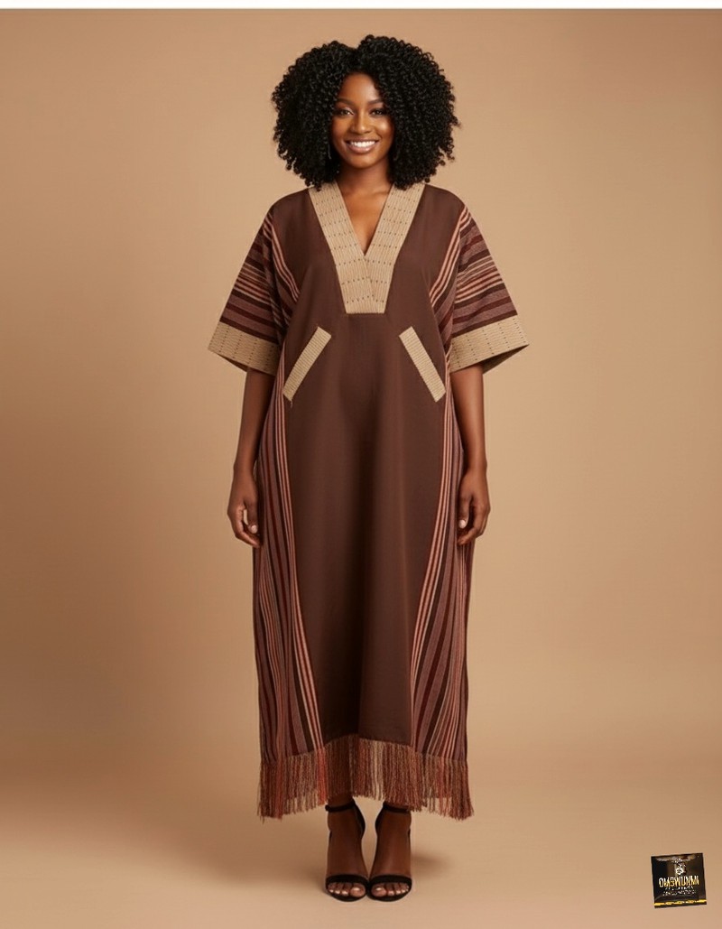 Effortlessly elegant, this chocolate brown kaftan radiates warmth and sophistication. Designed with subtle woven stripes and a graceful fringe hemline, it’s perfect for both casual and formal occasions. The relaxed fit flatters every shape, creating a timeless look of understated luxury.