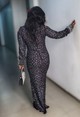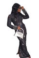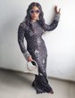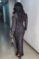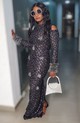 Delicately handmade from a rare stretchy fabric and designed with fur fabric, this piece is a figure-hugging long sleeves, long dress featuring a small slit and zipper at the back.