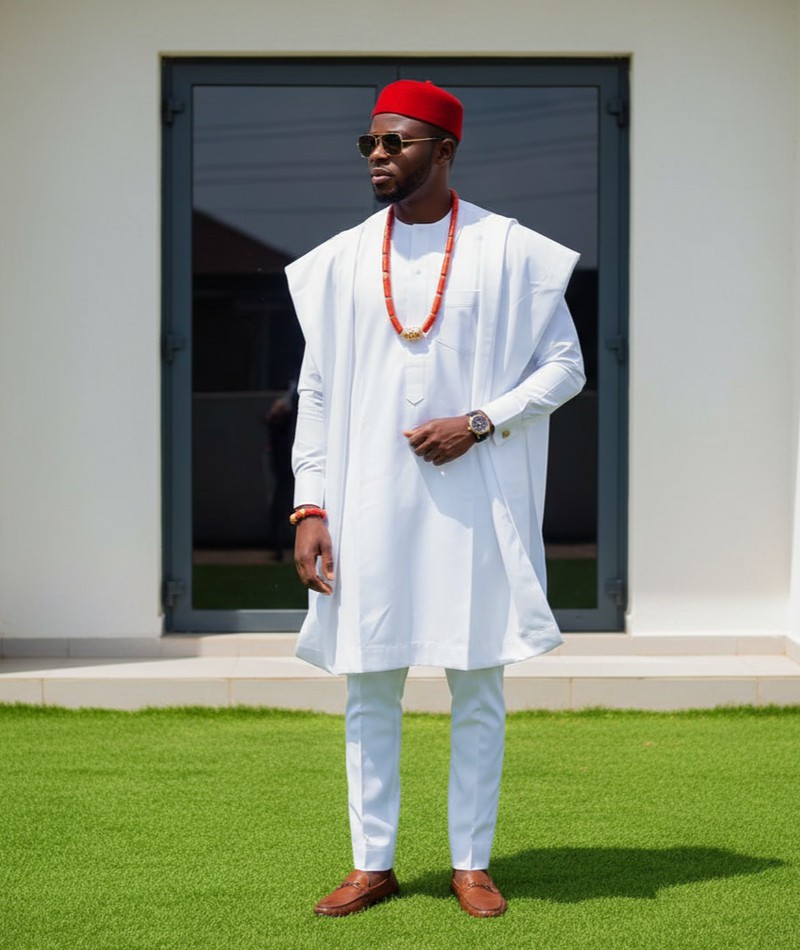Discover the ultimate Nigerian groom or guest style. See the crisp white Agbada, striking Igbo red cap (Okpu Agu), and traditional coral beads. Perfect for weddings, cultural events, and high fashion.