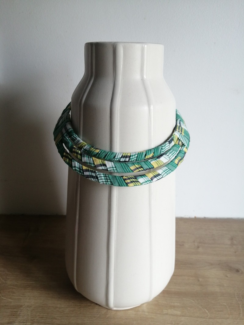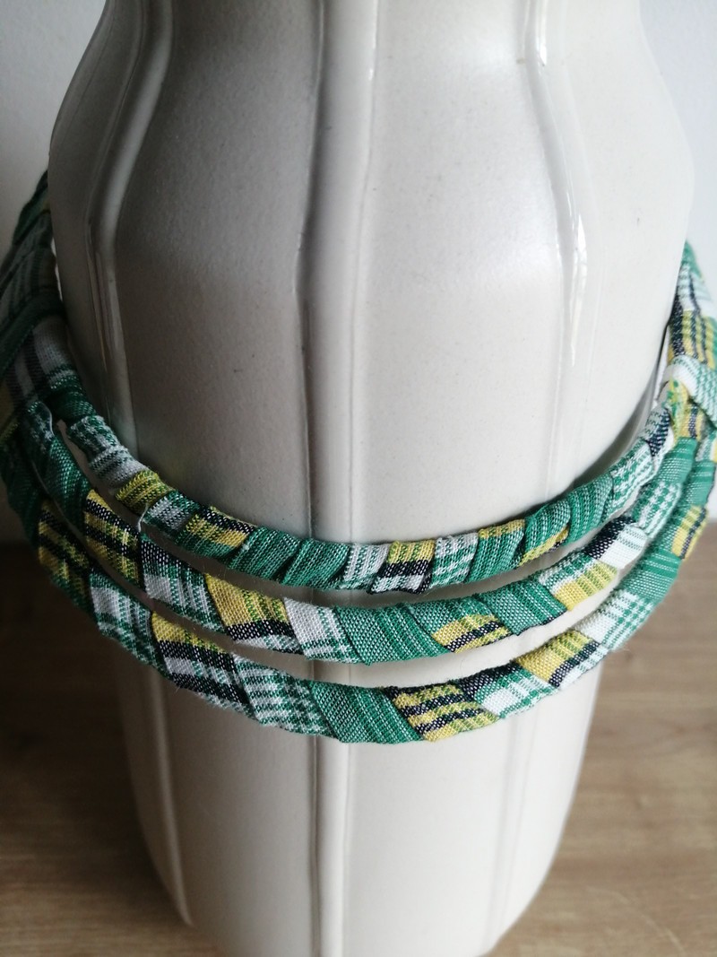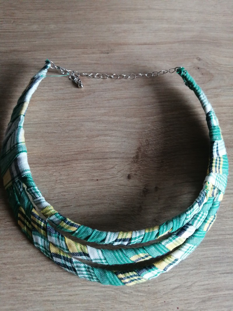 Collier Madras Besson vert et jaune ras-du-cou en forme de cercle diamètre 18 cm réglable avec une chaînette.
