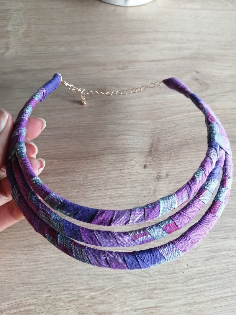 Collier Madras La Jaille violet ras-du-cou en forme de cercle diamètre 18 cm réglable avec une chaînette.