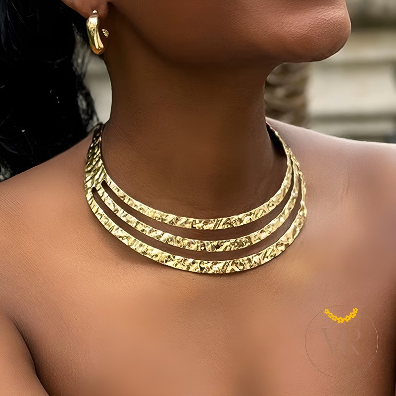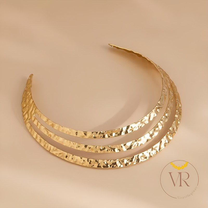 Ce collier à trois rangs martelés s’inspire des ornements portés par les Nubiens, peuple de la vallée du Nil reconnu pour ses bijoux dorés symbolisant puissance et royauté. Les anneaux martelés capturent la lumière et rappellent les parures anciennes, où chaque bijou représentait richesse, protection et identité.