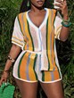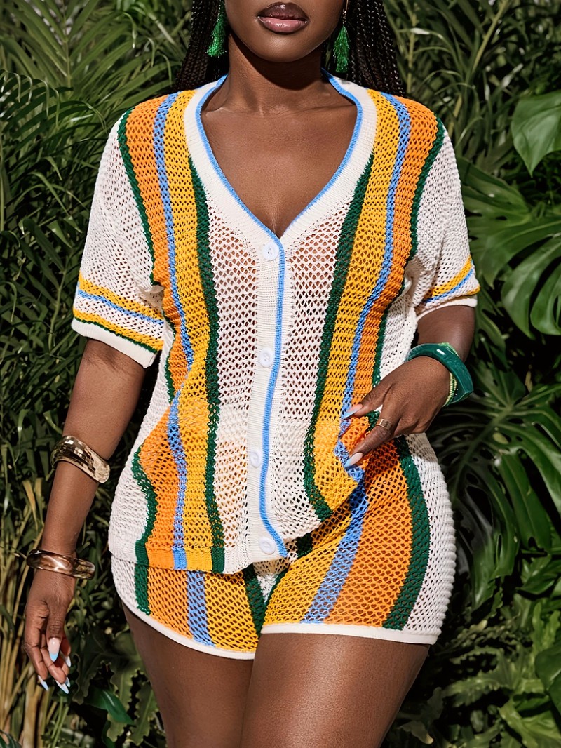 Colorful Striped Knit V-Neck Short Sleeve Top and Shorts Set - Casual Vacation Style, Two-Tone Design with Front Zipper and Button Closure
