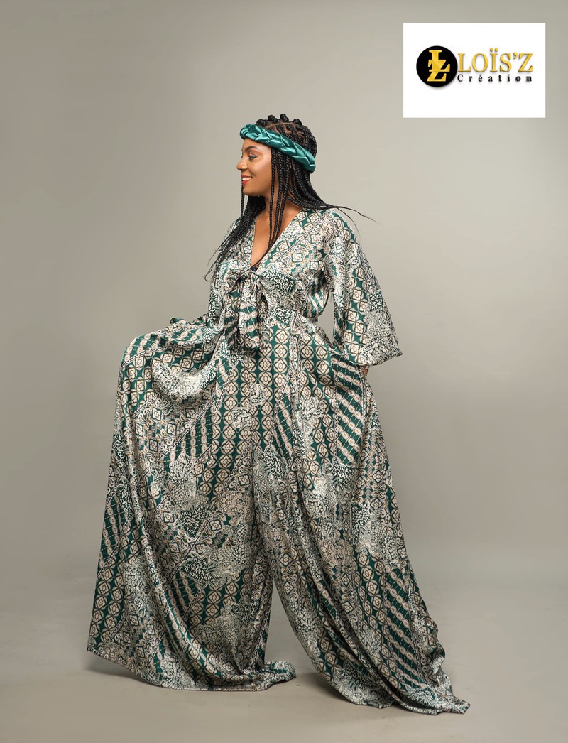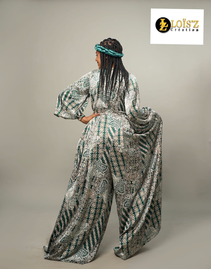 Une combinaison en soie ave un bas large et une fermeture a glissière dans le dos.
