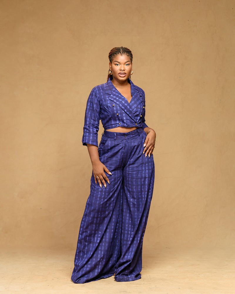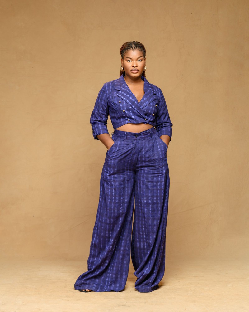 Combinaison top en veste croisé ouvert dans le ventre avec un pantalon légèrement évasé.