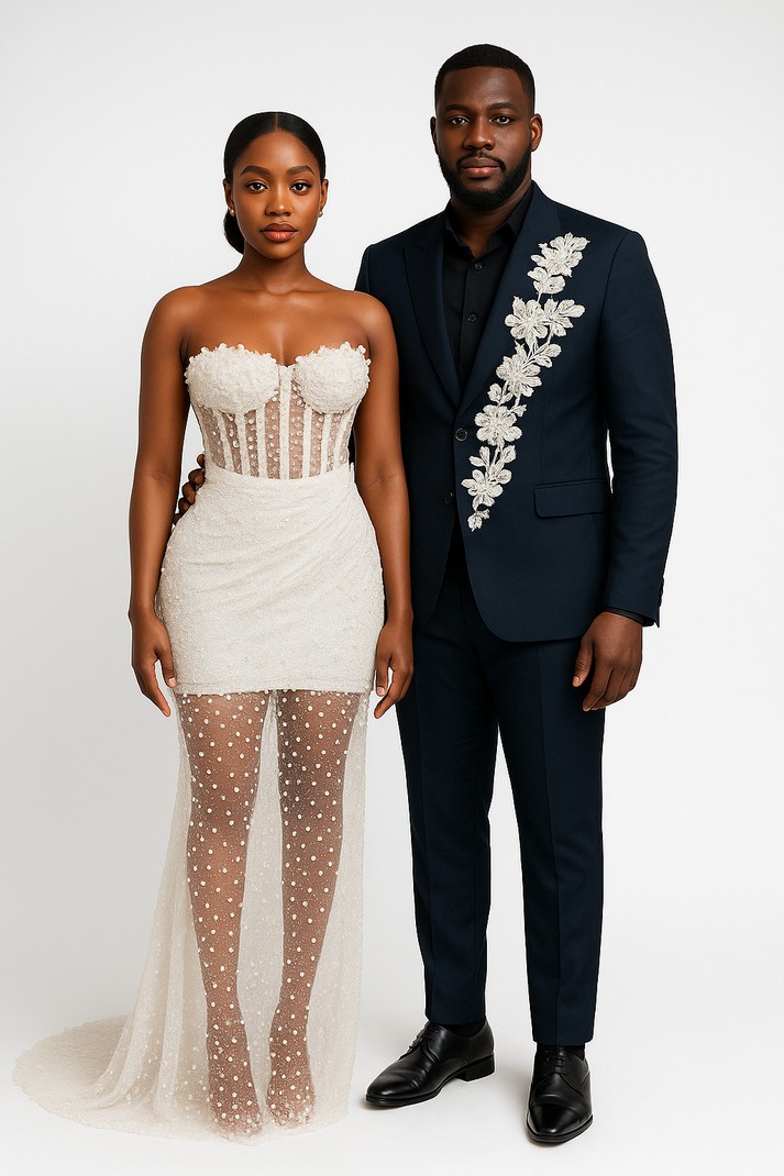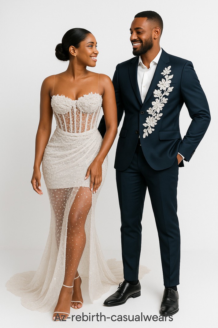 This beautiful couple's dress is perfect for weddings or any special event where you and your loved one can make a statement together. Made with high-quality luxury fabrics and exceptional tailoring, these dresses are truly unforgettable.