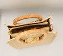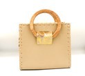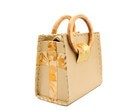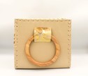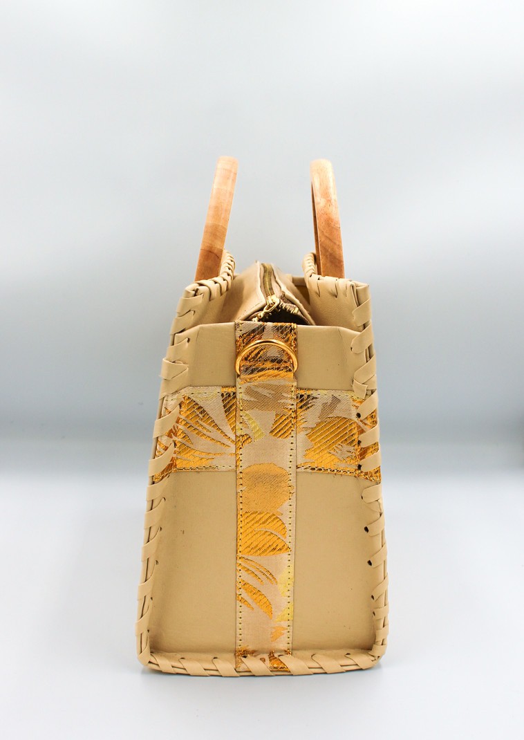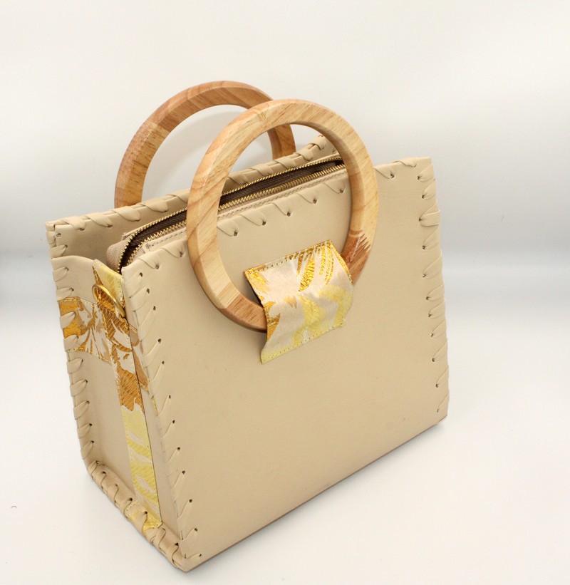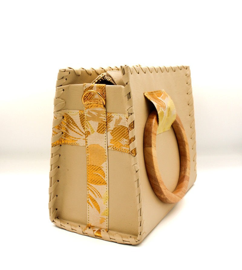 Key Features: Made from premium vegan leather and hand-stitched for a polished finish, this mini tote features authentic gold sego fabric detailing and sustainably sourced wooden handles. Its boxy, structured shape offers both elegance and everyday practicality, making it the perfect blend of form and function.