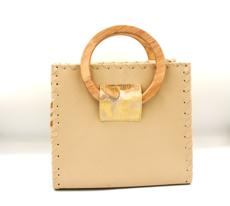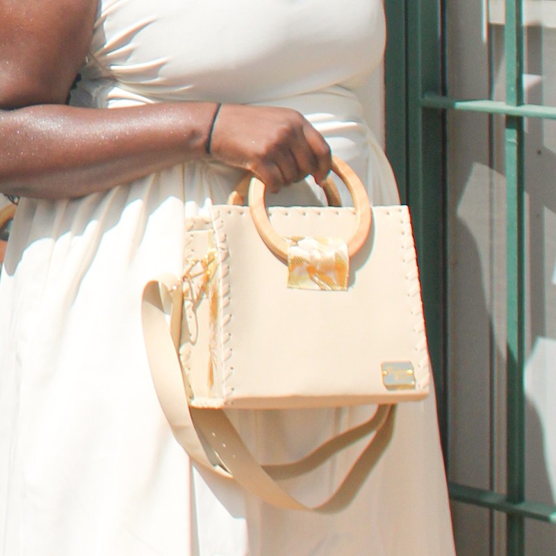 Designed for the elegant woman with a love for heritage and refined details, this structured mini tote combines timeless West African tradition with modern minimalism. Crafted to carry your daily must-haves—from your phone and cardholder to your lipstick and light notebook—this bag transitions seamlessly from day to night. The creamy vegan leather body offers a clean, polished base, while the signature wooden circular handles provide a natural, artisanal touch.