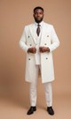 This exquisite and commanding ensemble features a rich cream white overcoat that serves as the ultimate statement piece, tailored in a striking double-breasted style with broad, classic peak lapels and contrasting dark buttons. The coat is layered over a matching three-piece suit in the same pristine white hue, creating an undeniably sophisticated monochromatic look. The inner suit consists of a jacket, a double-breasted waistcoat, and clean, tailored trousers. Accented by a deep chocolate brown tie for a refined contrast and finished with sharp black dress shoes, this outfit is the epitome of luxurious occasion wear, perfect for upscale evening events, winter weddings, or high-fashion statements.