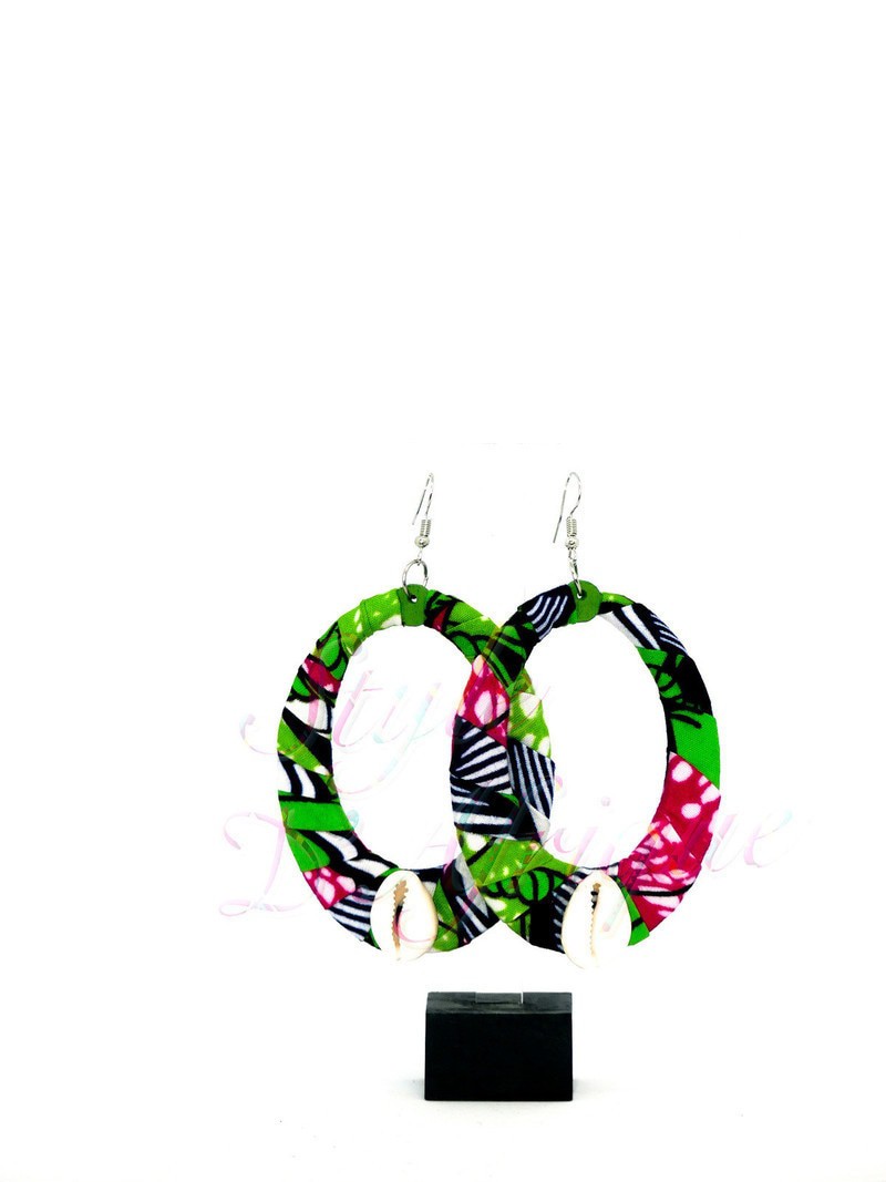 Je vend ces jolies boucles d'oreilles de forme ovales ornées de cauris de type africain en pagne wax plusieurs coloris. Se portent avec tout type de vêtements été comme hiver.