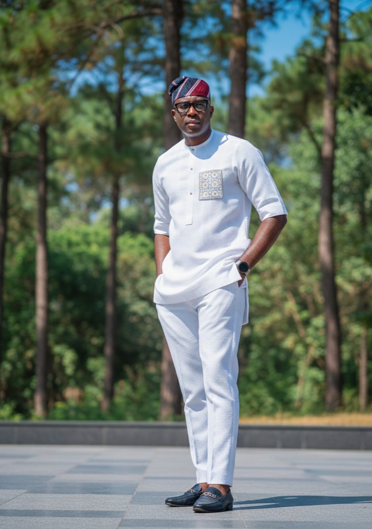 Elevate your presence with this bespoke 3-piece African Men's Suit, an exquisite blend of timeless tradition and modern sophistication. Featuring a crisp White Kaftan,