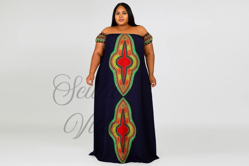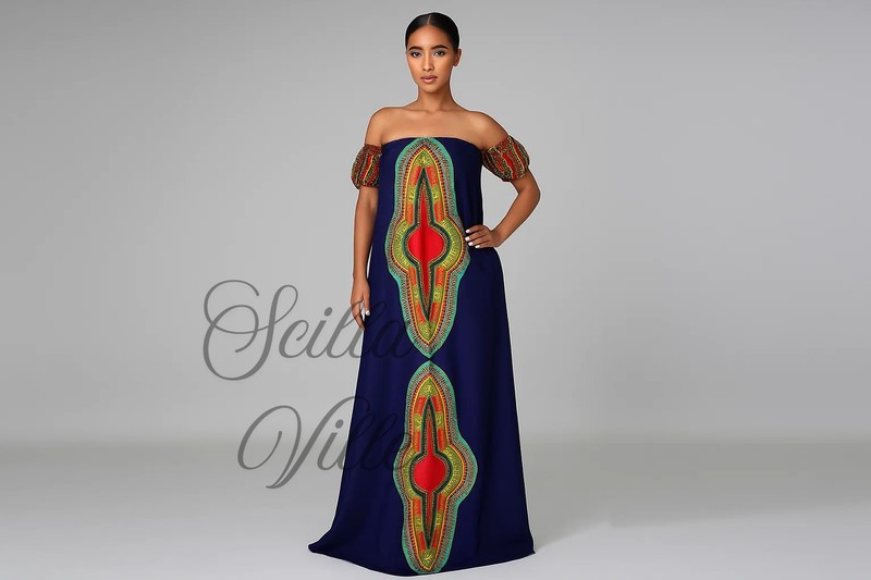 Black dress with a touch of dashiki, made with quality crepe and cotton dashiki. It is a flowing maxi dress with elastic at the chest region (for wearer's ease) and short sleeves. For custom orders please provide basic measurements like:bust-40