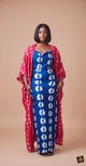 This striking two-piece set offers a sophisticated and versatile approach to contemporary African luxury, featuring a sleek, floor-length bodycon dress paired with a vibrant, oversized kimono. Both pieces are meticulously crafted from premium hand-dyed Adire fabric, showcasing a captivating blue and white sunburst motif on the inner gown and a coordinating raspberry red with white circular patterns on the sheer, lightweight outer robe. The inner dress is tailored to emphasize the silhouette with a graceful cowl neckline, while the open-front kimono adds a regally draped layer with wide, flowing sleeves that create an air of effortless elegance. This ensemble is an ideal choice for high-profile cultural celebrations, luxury resort evenings, or upscale garden parties where you want to make a bold, fashionable statement.