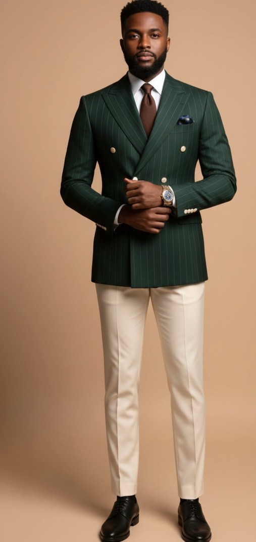 Presenting a sartorial masterpiece, this sophisticated double-breasted blazer is cut from a luxurious green fabric, offering a rich, distinctive color that commands attention. The jacket features a classic peak lapel and is elegantly adorned with six gold-tone tone buttons, two functional for closure and four decorative, lending a touch of refined vintage flair. Paired impeccably with slim-fit beige trousers, the look achieves a perfect balance between bold color and timeless elegance, making it an ideal ensemble for formal events, sophisticated social gatherings, or professional settings where distinction is key, completed by a crisp white shirt and dark leather shoes.