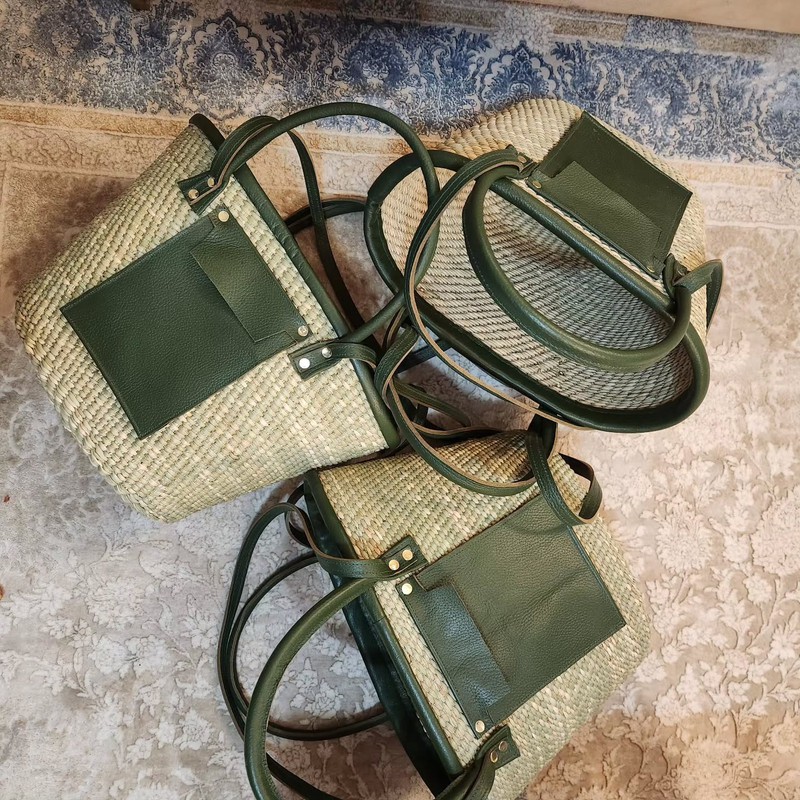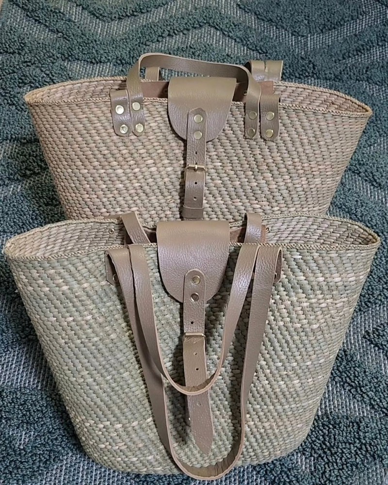 This unique piece is handmade with love from weaving of graphic grass and complemented for statement piece with soft leather