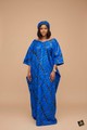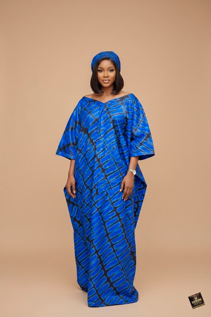 This captivating royal blue maxi Kaftan is a stunning example of traditional West African textile art reimagined for the modern wardrobe, expertly crafted from premium, high-luster hand-dyed Adire cotton that provides a rich, tactile finish and a graceful, voluminous drape. The garment features a mesmerizing all-over "grid" or "honeycomb" motif, where deep indigo outlines frame vibrant cobalt blue cells to create a rhythmic and elongating visual texture. Its design is characterized by a wide, elegant boat neckline and dramatically oversized kimono sleeves that flow into a classic, relaxed Kaftan silhouette, offering both supreme comfort and a regal presence. This ensemble, which includes a matching structured headwrap, is an impeccable choice for high-profile traditional weddings, milestone anniversary celebrations, or prestigious cultural galas, ensuring you command the room with a perfect blend of heritage-inspired craftsmanship and contemporary sophistication.