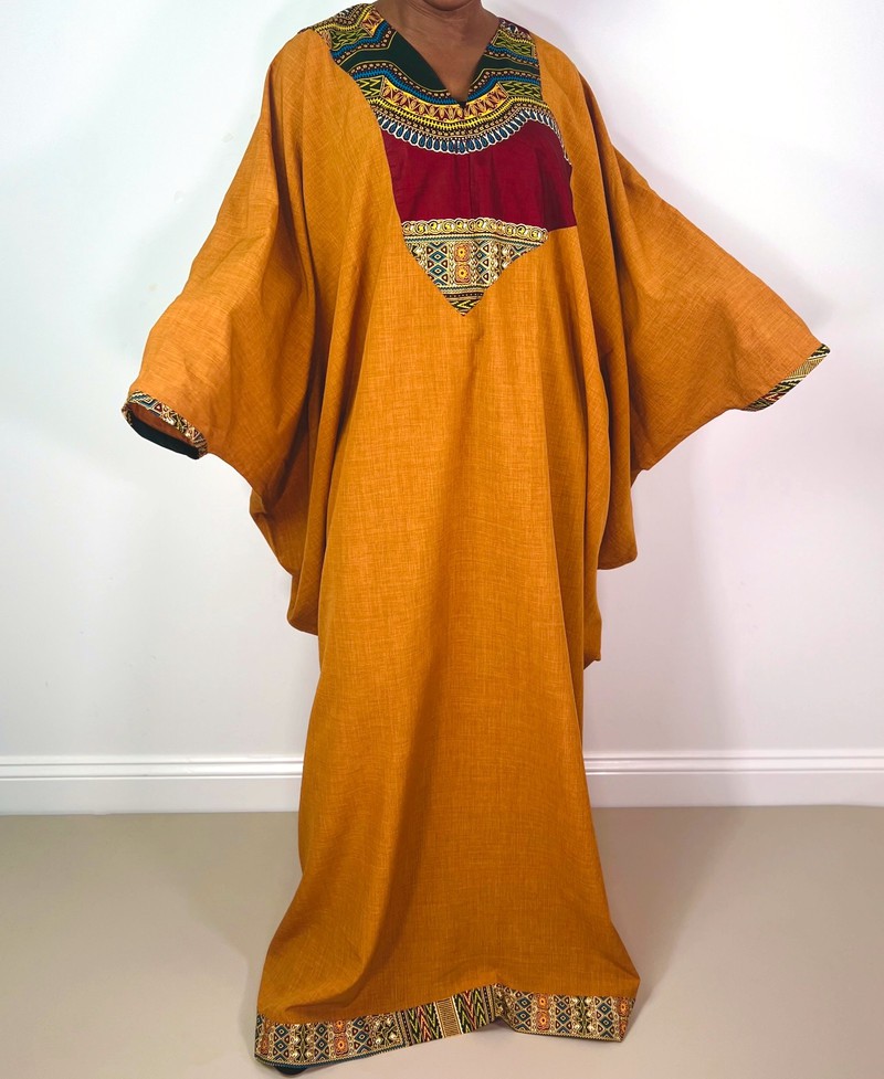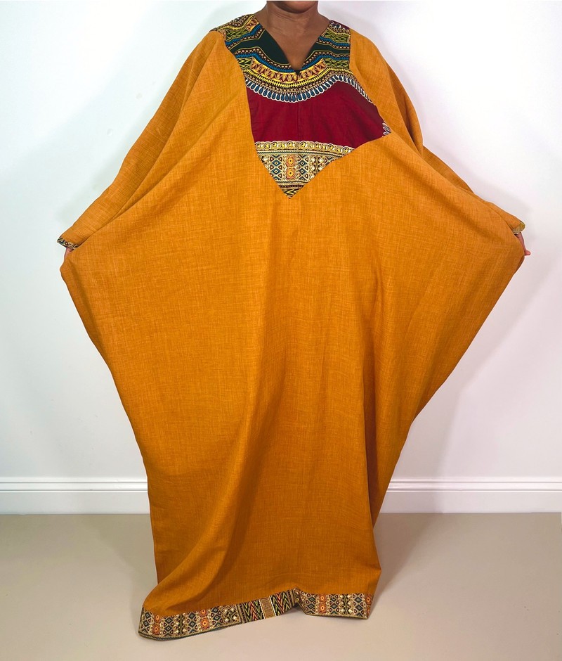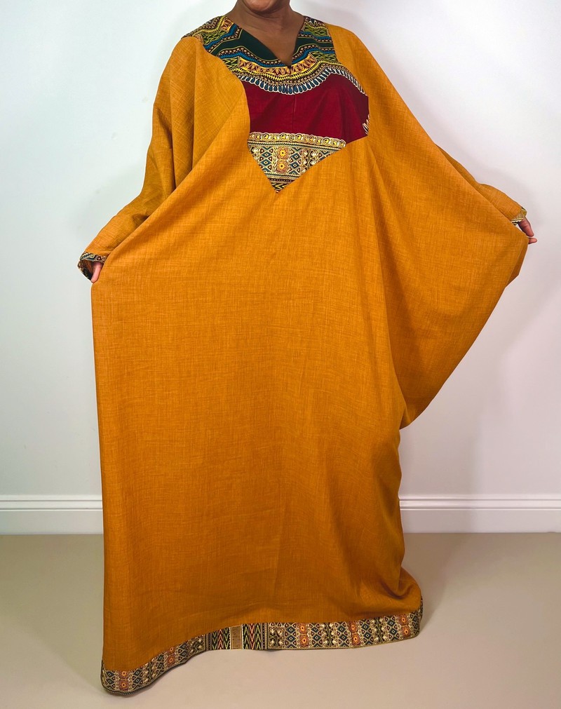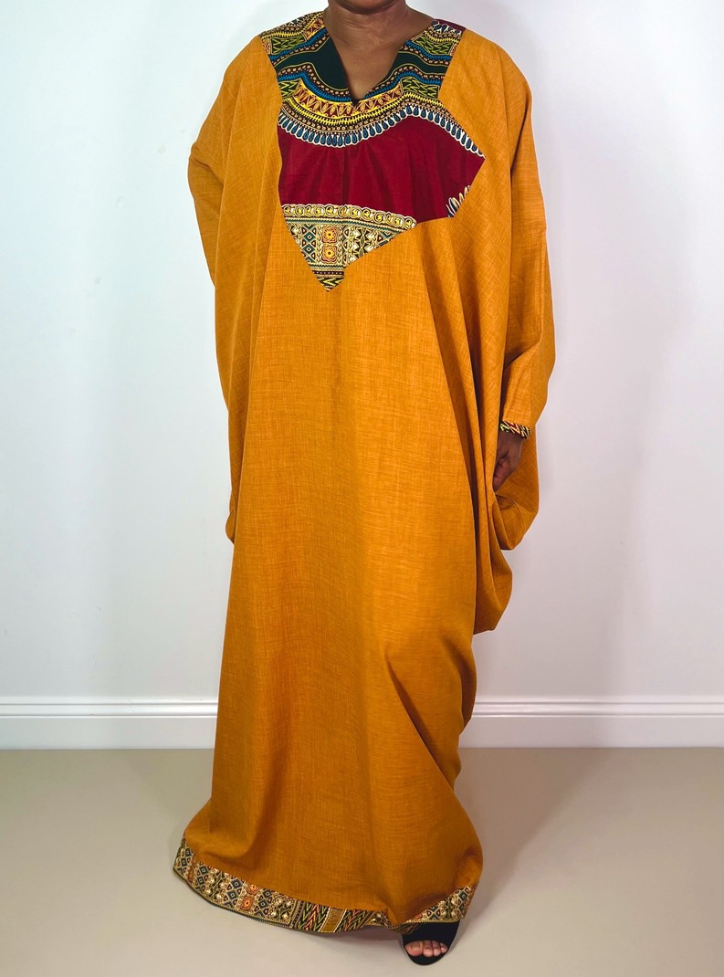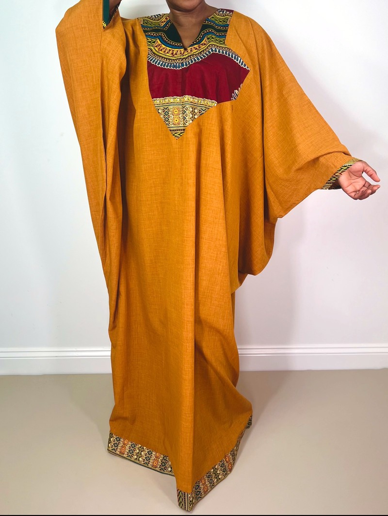 Elegant mustard tribal patchwork design oversized Maxi kaftan dress